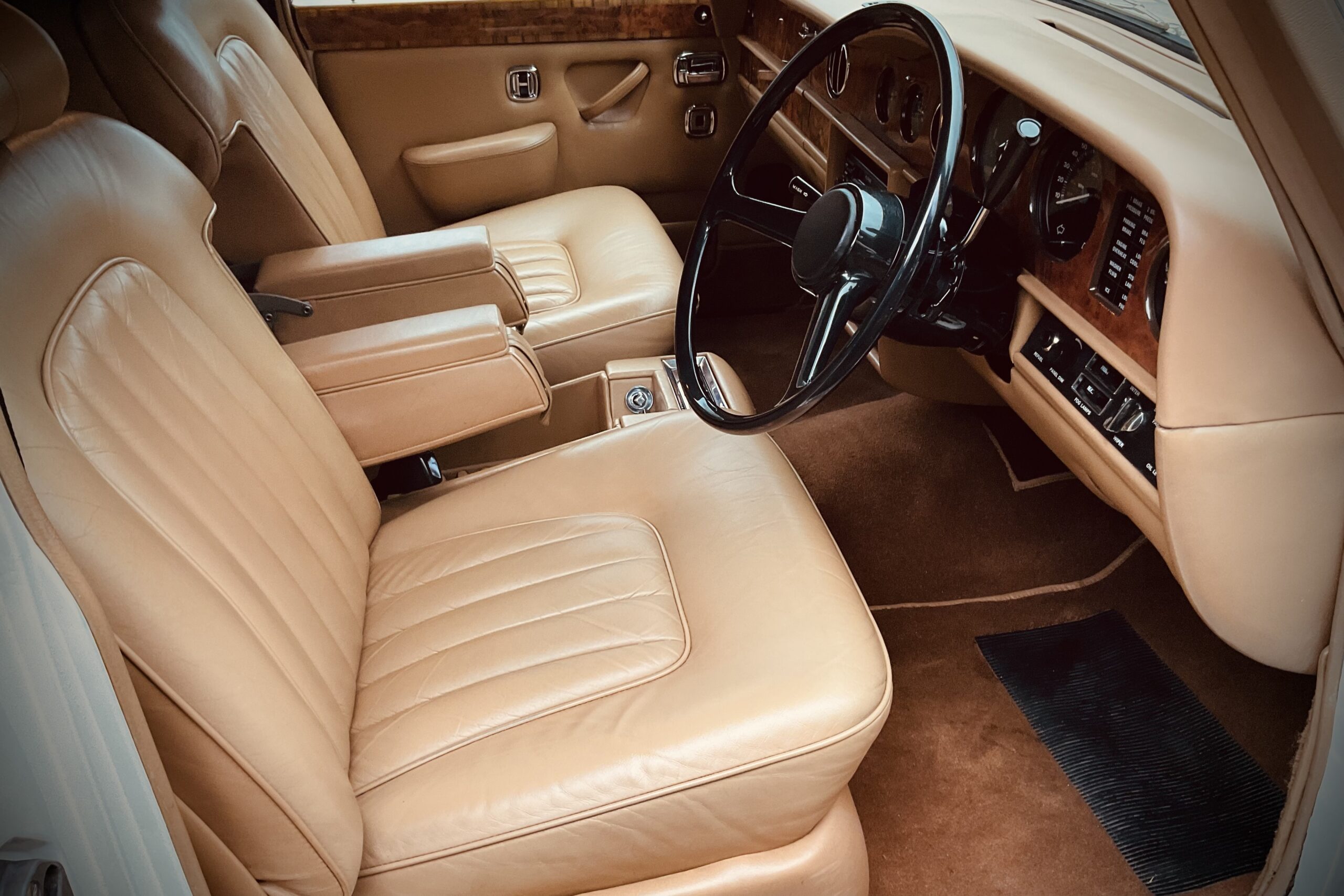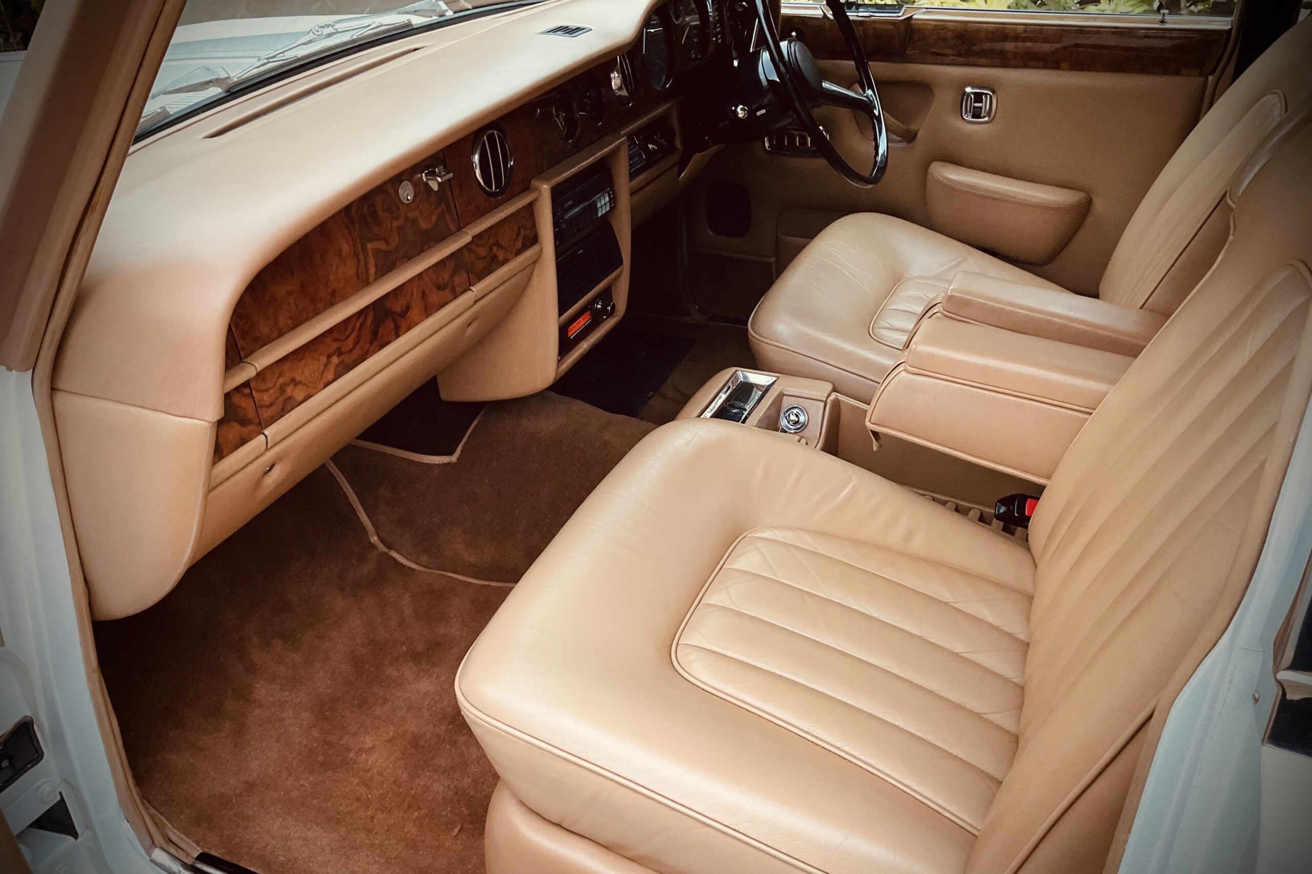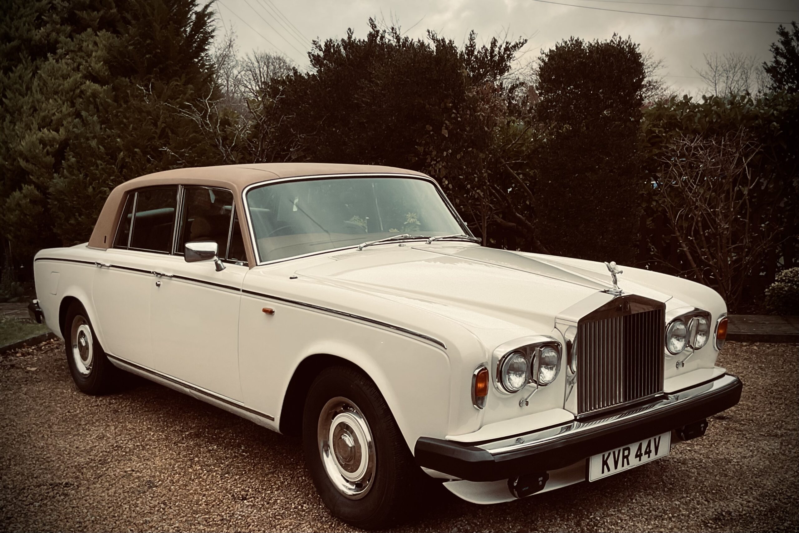 Step into timeless romance with our 1980 Rolls-Royce Silver Shadow II in Old English White with an elegant Everflex roof. Its hand-stitched tan leather and polished wood create an intimate, opulent interior that feels like a private haven. Celebrated for its whisper-quiet ride and graceful poise, this icon is pure British heritage. Ideal for a serene journey to your ceremony or as a stately backdrop for photography, the Silver Shadow II delivers unforgettable classic charm